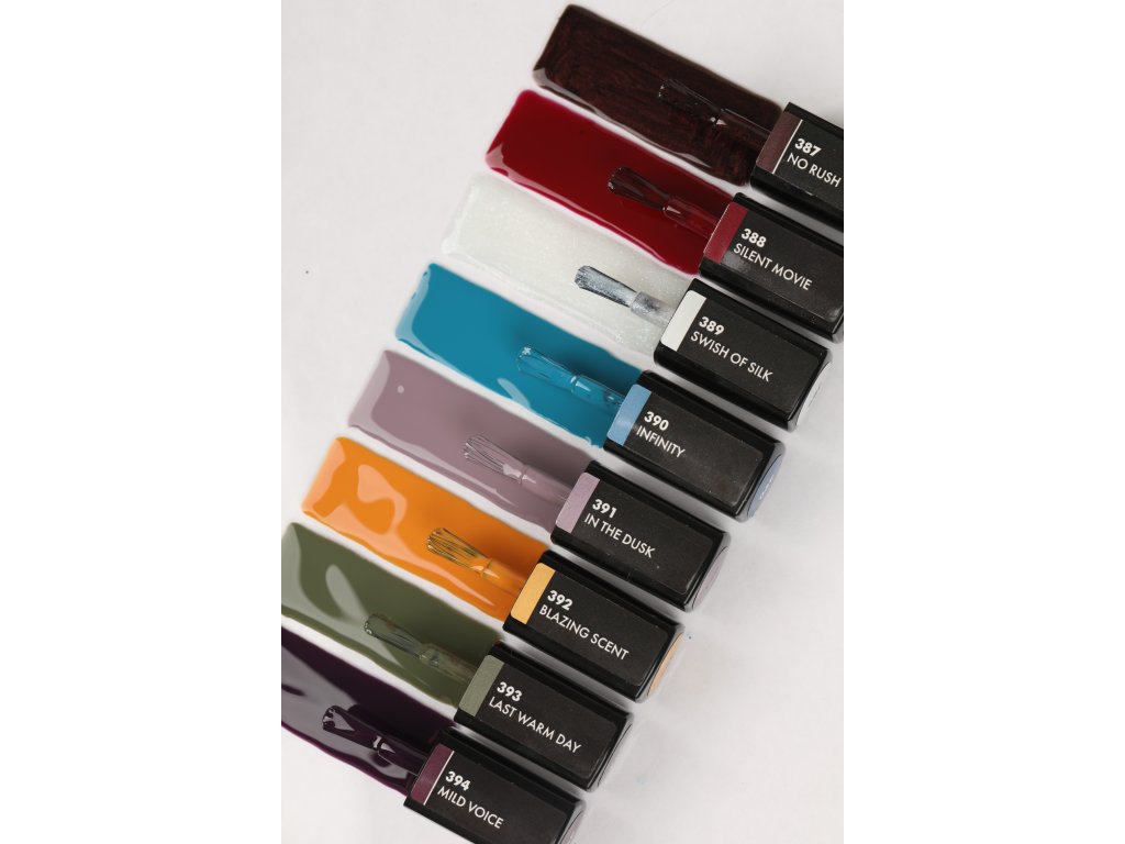 - E.MiLac No Rush č. 387: Inspirováno vintage dřevem, odstín tmavý dub, velmi ušlechtilé, drahé, luxusní. Hluboká čokoláda, která byla prezentována v módních kolekcích v různých časopisech: ve svrchním oblečení, v každodenní a večerní módě. Skvělá alternativa k černé.