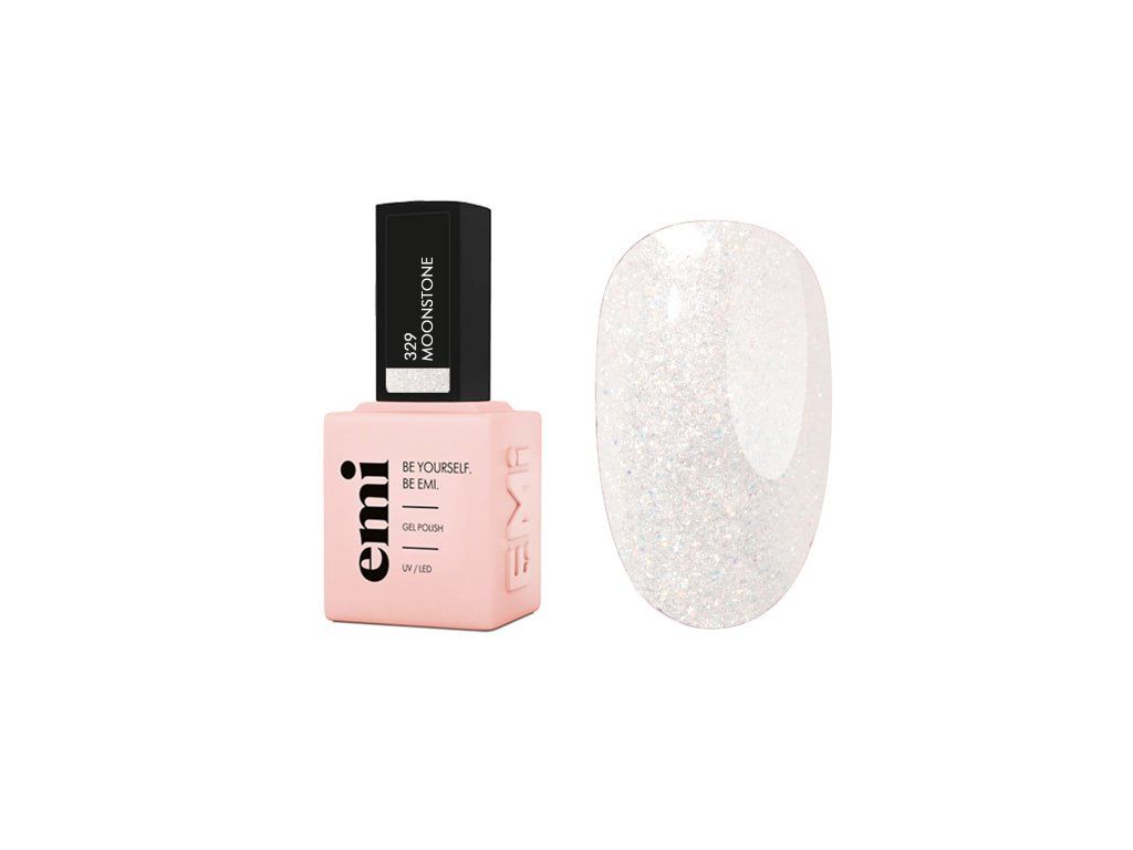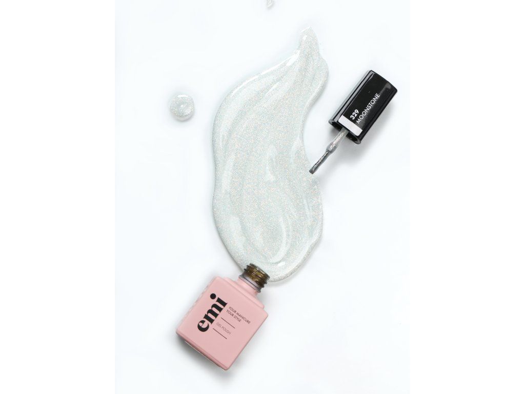 - E.MiLac Moonstone #329, 9 ml. Ušlechtilý poloprůhledný bílý odstín s jemnými třpytivými částečkami.