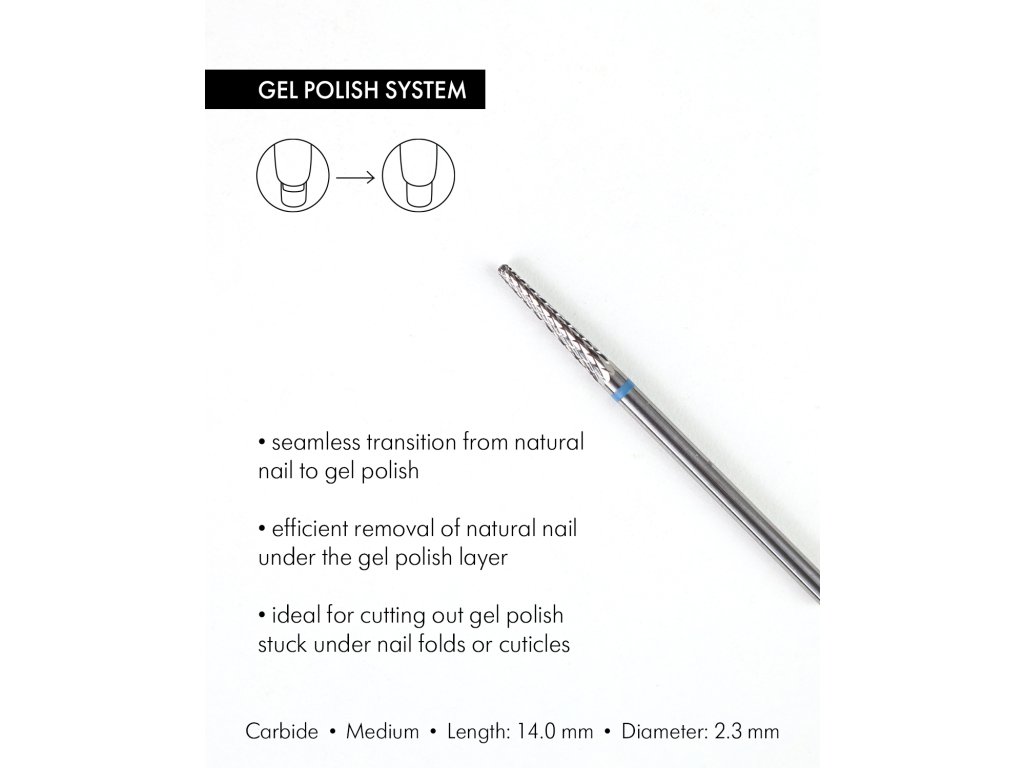 Kuželová karbidová rotační frézka, 2,3 mm – dokonalé řešení pro nehtové techniky. S toto frézkou je nyní snazší odstranit hranici mezi gelovým lakem a nehtovou ploténkou.