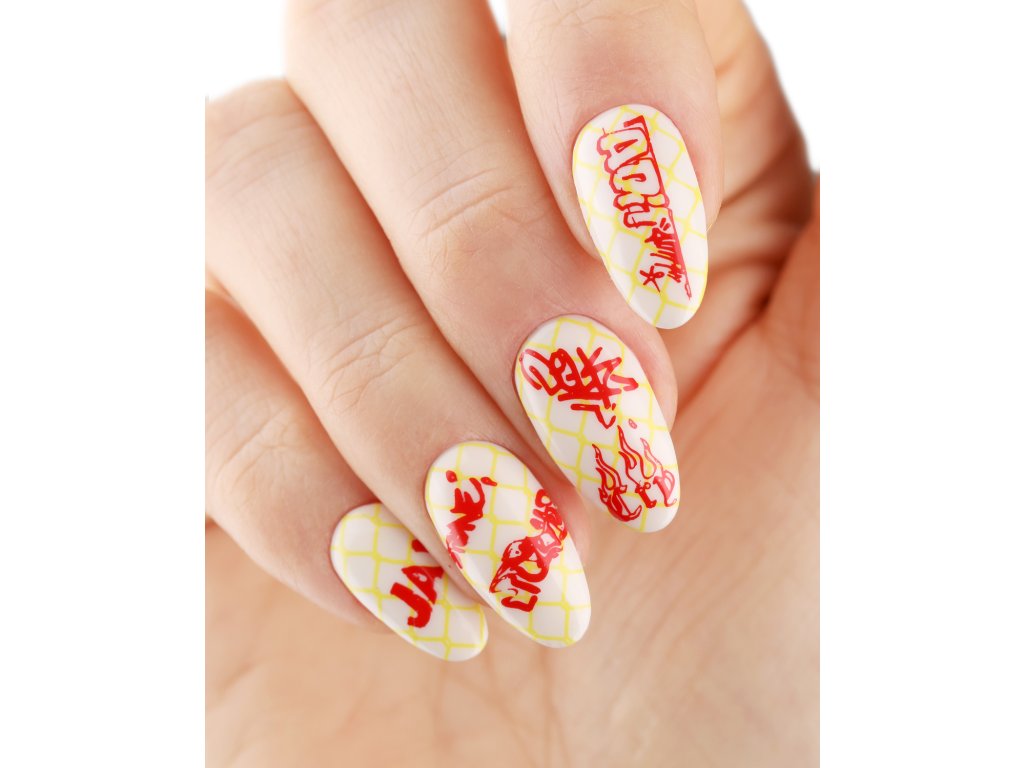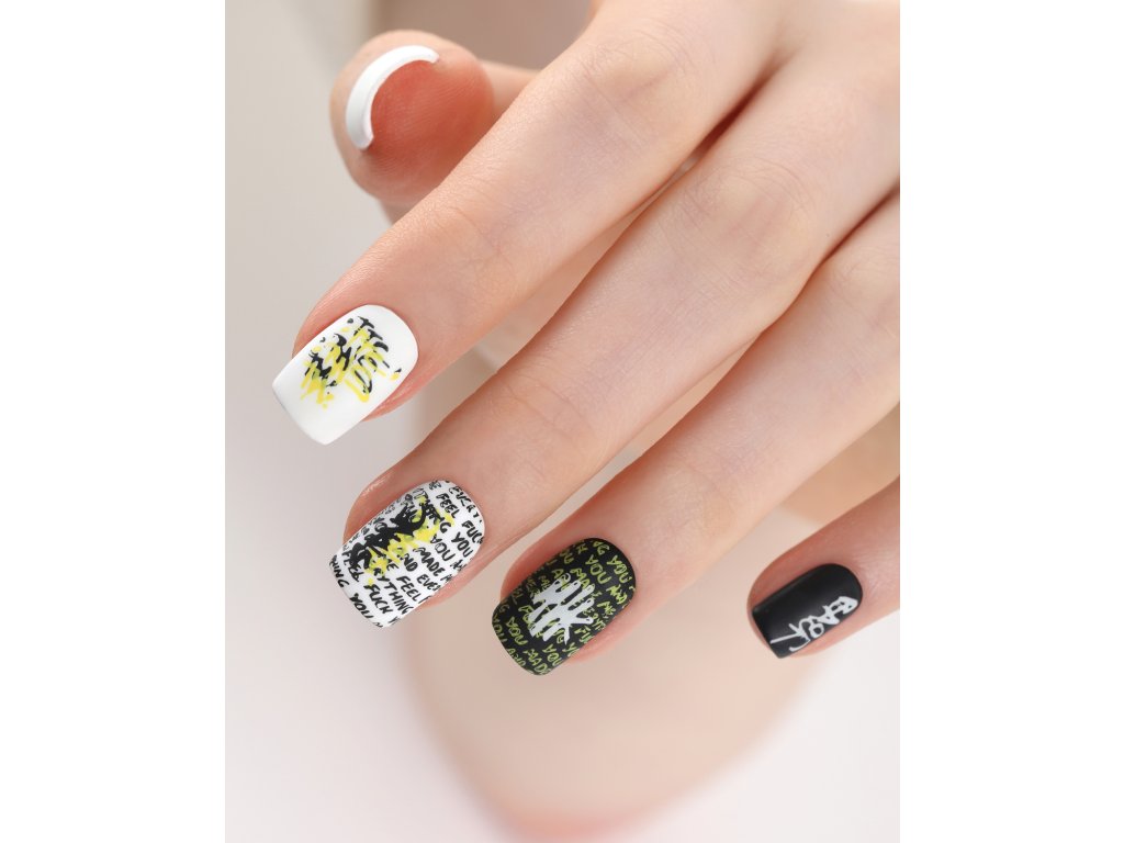 - Paleta razítkovacích laků na nehty zahrnuje klasické barvy, jako je bílá, černá, modrá, zelená, žlutá a červená, což umožňuje mnoho různých vzorů nehtů.